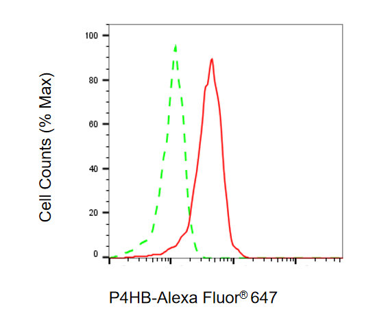 Flow cytometric analysis of P4HB expression in HepG2 cells using P4HB antibody. Green, isotype control; red, P4HB.