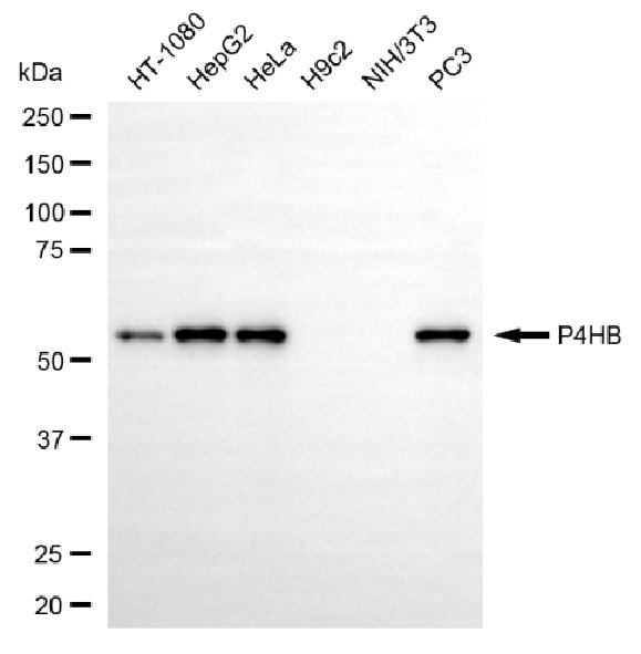 Western blotting analysis using P4HB antibody. Total cell lysates (30 μg) from various cell lines were loaded and separated by SDS-PAGE. The blot was incubated with P4HB antibody and HRP-conjugated goat anti-mouse secondary antibody respectively.