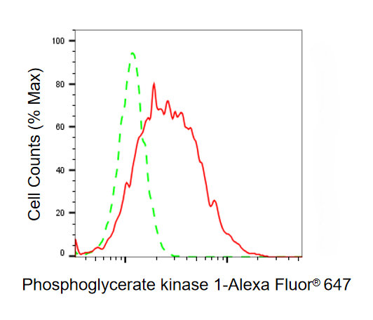 Flow cytometric analysis of Phosphoglycerate kinase 1 expression in HepG2 cells using Phosphoglycerate kinase 1 antibody. Green, isotype control; red,Phosphoglycerate kinase 1.