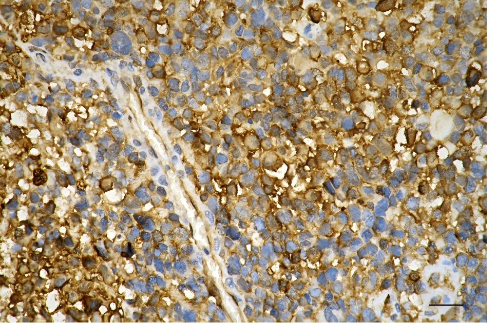 Immunohistochemistry was performed on paraffin-embedded human glioblastoma using phosphoglycerate kinase 1 antibody. Antigen retrieval was done in sodium citrate buffer (pH 6.0). DAB was used for detection, with hematoxylin counterstaining. Images were acquired using a Nikon Ci-L Plus microscope (40× objective). Scale bar: 25 μm.