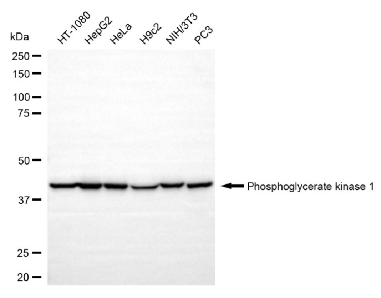 Western blotting analysis using phosphoglycerate kinase 1 antibody. Total cell lysates (30 μg) from various cell lines were loaded and separated by SDS-PAGE. The blot was incubated with phosphoglycerate kinase 1 antibody and HRP-conjugated goat anti-mouse secondary antibody respectively.