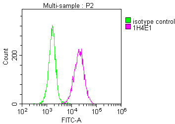 Overlay Peak curve showing 293T cells stained with CSB-MA614884A0m (red line) at 1:100. The cells were incubated in 10% normal goat serum to block non-specific protein-protein interactions followed by the antibody (1μg/1*106cells) for 1h at 4°C. The secondary antibody used was FITC-conjugated Goat Anti-Mouse IgG(H+L) at 1/100 dilution for 30min at 4°C. Isotype control antibody (green line) was mouse IgG1 (1μg/1*106cells) used under the same conditions. Acquisition of >10,000 events was performed.