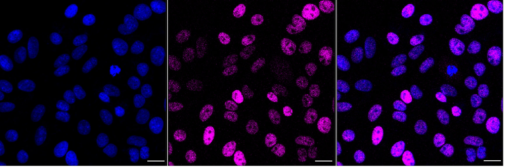 Immunocytochemical staining of HepG2 cells with RBBP7 antibody. Nuclei were stained blue with DAPI; RBBP7 was stained magenta with Alexa Fluor? 647. Images were taken using Leica stellaris 5. Protein abundance based on laser Intensity and smart gain: Low. Scale bar, 20 μm.