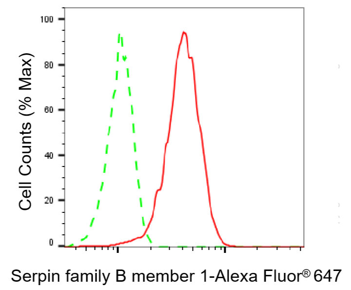 Flow cytometric analysis of Serpin family B member 1 expression in HepG2 cells using Serpin family B member 1 antibody. Green, isotype control; red, Serpin family B member 1.