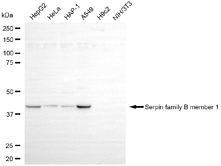 Western blotting analysis using serpin family B member 1 antibody. Total cell lysates (30 μg) from various cell lines were loaded and separated by SDS-PAGE. The blot was incubated with serpin family B member 1 antibody and HRP-conjugated goat anti-mouse secondary antibody respectively.