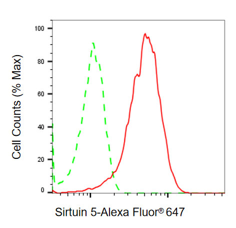 Flow cytometric analysis of Sirtuin 5 expression in HepG2 cells using Sirtuin 5 antibody. Green, isotype control; red, Sirtuin 5.
