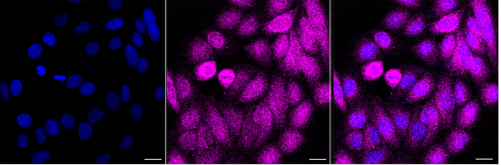 Immunocytochemical staining of HepG2 cells with Sirtuin 5 antibody. Nuclei were stained blue with DAPI; Sirtuin 5 was stained magenta with Alexa Fluor? 647. Images were taken using Leica stellaris 5. Protein abundance based on laser Intensity and smart gain: Medium. Scale bar, 20 μm.