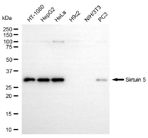 Western blotting analysis using sirtuin 5 antibody. Total cell lysates (30 μg) from various cell lines were loaded and separated by SDS-PAGE. The blot was incubated with sirtuin 5 antibody and HRP-conjugated goat anti-mouse secondary antibody respectively.