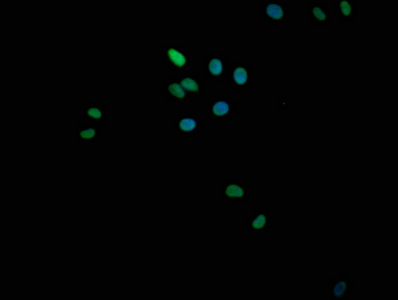 Immunofluorescence staining of Hela cells with CSB-MA875720A0m at 1:100, counter-stained with DAPI. The cells were fixed in 4% formaldehyde and blocked in 10% normal Goat Serum. The cells were incubated with the antibody overnight at 4°C. Nuclear DNA was labeled in blue with DAPI. The secondary antibody was FITC-conjugated AffiniPure Goat Anti-Mouse IgG (H+L).