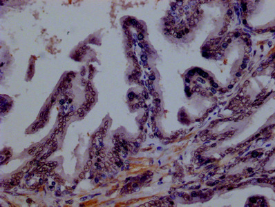 IHC image of CSB-MA875720A0m diluted at 1:100 and staining in paraffin-embedded human prostate tissue performed on a Leica BondTM system. After dewaxing and hydration, antigen retrieval was mediated by high pressure in a citrate buffer (pH 6.0). Section was blocked with 10% normal goat serum 30min at RT. Then primary antibody (1% BSA) was incubated at 4°C overnight. The primary is detected by a biotinylated secondary antibody and visualized using an HRP conjugated SP system.