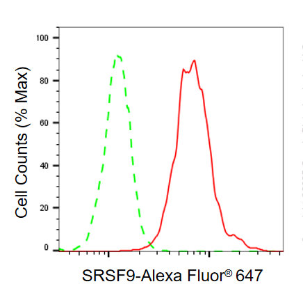 Flow cytometric analysis of SRSF9 expression in HeLa cells using SRSF9 antibody. Green, isotype control; red, SRSF9.