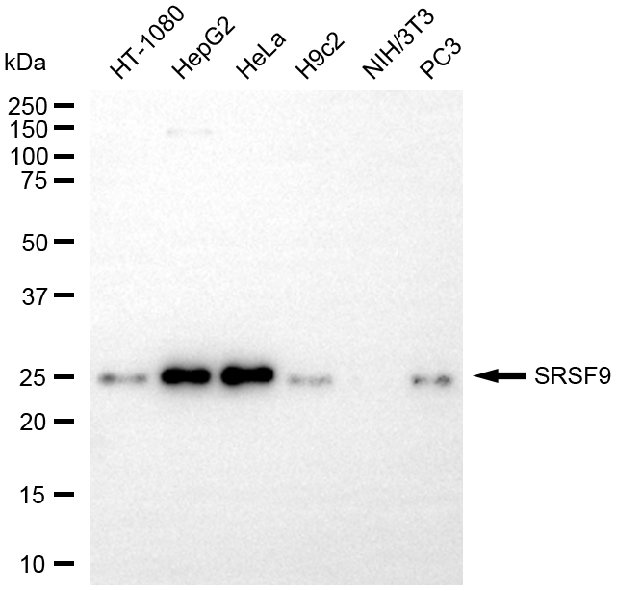 Western blotting analysis using SRSF9 antibody. Total cell lysates (30 μg) from various cell lines were loaded and separated by SDS-PAGE. The blot was incubated with SRSF9 antibody and HRP-conjugated goat anti-mouse secondary antibody respectively.