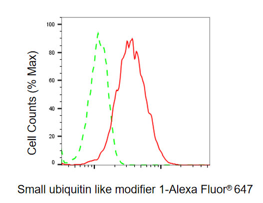 Flow cytometric analysis of Small ubiquitin like modifier 1 expression in HAP-1 cells using Small ubiquitin like modifier 1 antibody. Green, isotype control; red, Small ubiquitin like modifier 1.
