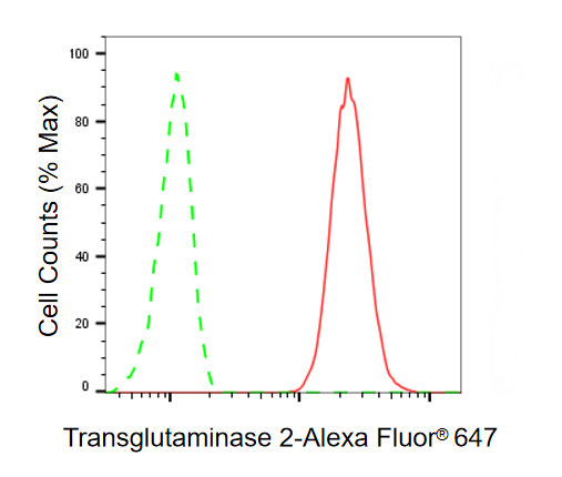 Flow cytometric analysis of Transglutaminase 2 expression in HT-1080 cells using Transglutaminase 2 antibody. Green, isotype control; red, Transglutaminase 2.