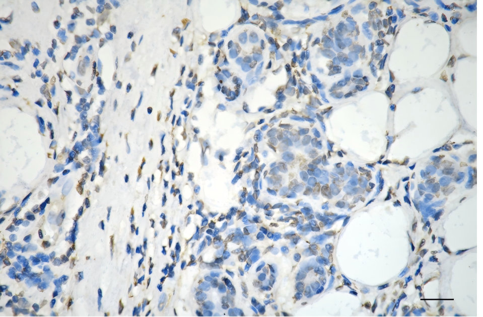 Immunohistochemistry was performed on paraffin-embedded human breast carcinoma using transglutaminase 2 antibody. Antigen retrieval was done in sodium citrate buffer (pH 6.0). DAB was used for detection, with hematoxylin counterstaining. Images were acquired using a Nikon Ci-L Plus microscope (40× objective). Scale bar: 25 μm.