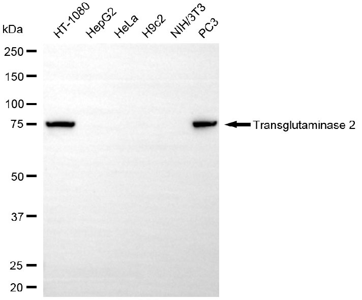 Western blotting analysis using transglutaminase 2 antibody. Total cell lysates (30 μg) from various cell lines were loaded and separated by SDS-PAGE. The blot was incubated with transglutaminase 2 antibody and HRP-conjugated goat anti-mouse secondary antibody respectively.