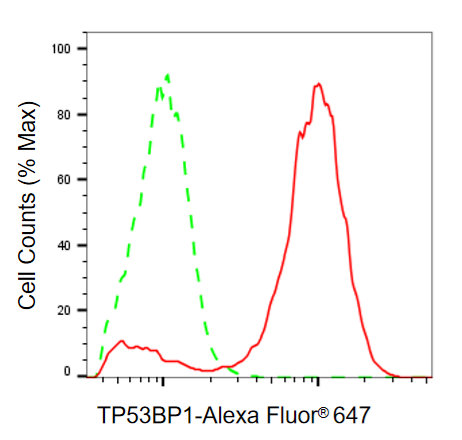 Flow cytometric analysis of TP53BP1 expression in HAP-1 cells using TP53BP1 antibody. Green, isotype control; red, TP53BP1.