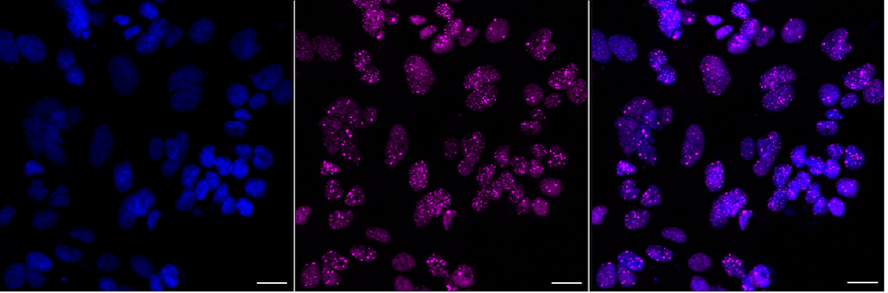 Immunocytochemical staining of HAP-1 cells with TP53BP1 antibody. Nuclei were stained blue with DAPI; TP53BP1 was stained magenta with Alexa Fluor? 647. Images were taken using Leica stellaris 5. Protein abundance based on laser Intensity and smart gain: Medium. Scale bar, 20 μm.