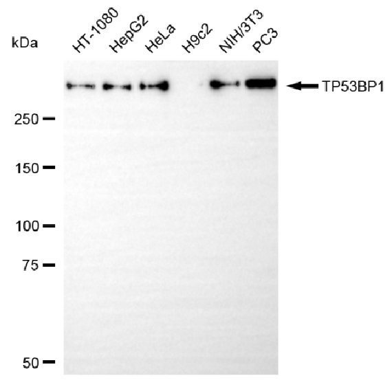 Western blotting analysis using TP53BP1 antibody. Total cell lysates (30 μg) from various cell lines were loaded and separated by SDS-PAGE. The blot was incubated with TP53BP1 antibody and HRP-conjugated goat anti-mouse secondary antibody respectively.