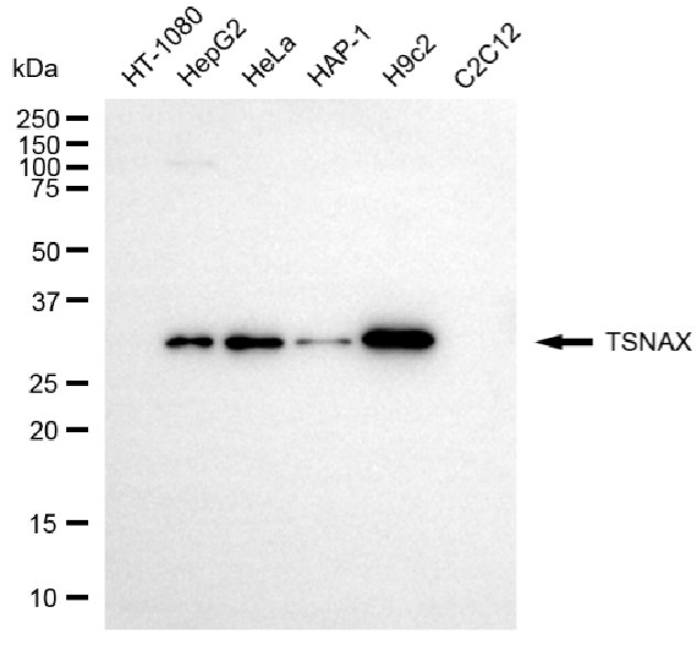 Western blotting analysis using TSNAX antibody. Total cell lysates (30 μg) from various cell lines were loaded and separated by SDS-PAGE. The blot was incubated with TSNAX antibody and HRP-conjugated goat anti-mouse secondary antibody respectively.