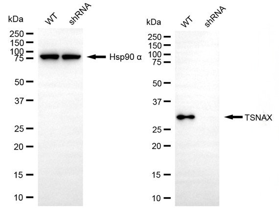 Western blotting analysis using TSNAX antibody. TSNAX expression in wild-type (WT) and TSNAX shRNA knockdown (KD) HeLa cells with 20 μg of total cell lysates. Hsp90 α serves as a loading control. The blot was incubated with TSNAX antibody and HRP-conjugated goat anti-mouse secondary antibody respectively.