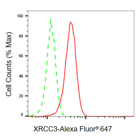 Flow cytometric analysis of XRCC3 expression in HeLa cells using XRCC3 antibody. Green, isotype control; red, XRCC3.