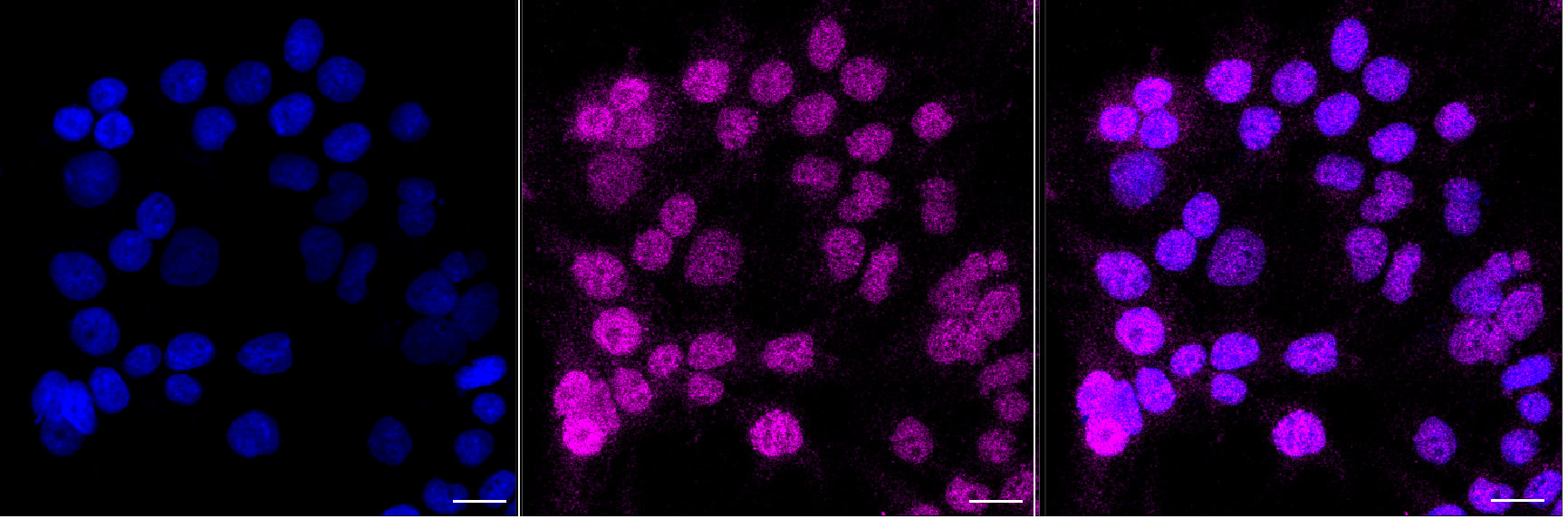 Immunocytochemical staining of Hela cells with XRCC3 antibody. Nuclei were stained blue with DAPI; XRCC3 was stained magenta with Alexa Fluor? 647. Images were taken using Leica stellaris 5. Protein abundance based on laser Intensity and smart gain: Medium. Scale bar, 20 μm.
