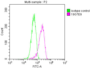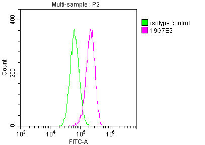 Overlay histogram showing A549 cells stained with CSB-MA026293A0m (red line) at 1:100. The cells were fixed in 4% formaldehyde and permeated by 0.2% TritonX-100. Then 10% normal goat serum was Incubated to block non-specific protein-protein interactions followed by the antibody (1μg/1*106cells) for 1 h at 4°C. The secondary antibody used was FITC-conjugated Goat Anti-Mouse IgG(H+L) at 1/100 dilution for 30min at 4°C. Isotype control antibody (green line) was mouse IgG2b (1μg/1*106cells) used under the same conditions. Acquisition of >10,000 events was performed.