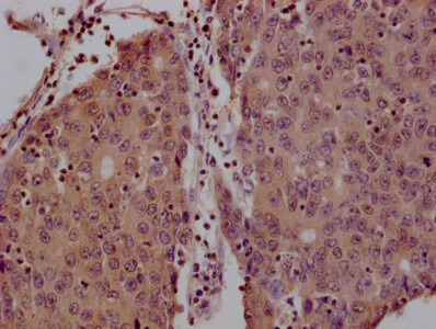 IHC image of CSB-MA026293A0m diluted at 1:200 and staining in paraffin-embedded human breast cancer tissue performed on a Leica BondTM system. After dewaxing and hydration, antigen retrieval was mediated by high pressure in a citrate buffer (pH 6.0). Section was blocked with 10% normal goat serum 30min at 37°C. Then primary antibody (1% BSA) was incubated at 4°C overnight. The primary is detected by a Goat anti-rabbit IgG labeled by HRP and visualized using 0.05% DAB.