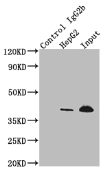 Lane 2: CSB-MA026293A0m (1μg) + HepG2 whole cell lysate (500μg)
