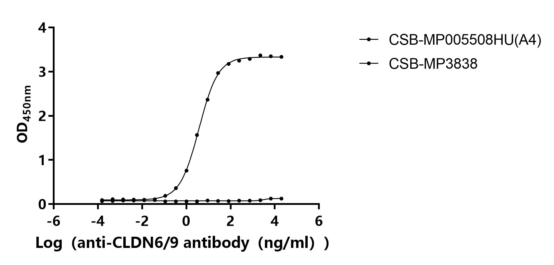 Measured by its binding ability in a functional ELISA. Immobilized Human CLDN6 at 2 μg/ml can bind Anti-CLDN6/9 recombinant antibody(CSB-RA005508MA3HU). The EC50 is 3.482-4.097 ng/mL.The VLPs (CSB-MP3838) is negative control. Biological Activity Assay -