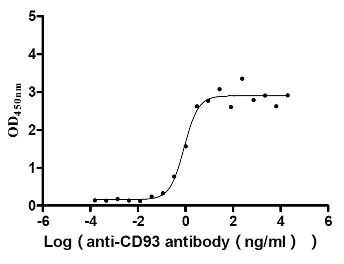 Measured by its binding ability in a functional ELISA. Immobilized Human CD93 at 2 μg/ml can bind Anti-CD93 recombinant antibody (CSB-RA865099MA1HU), the EC50 is 0.6639-1.173 ng/mL. Biological Activity Assay -