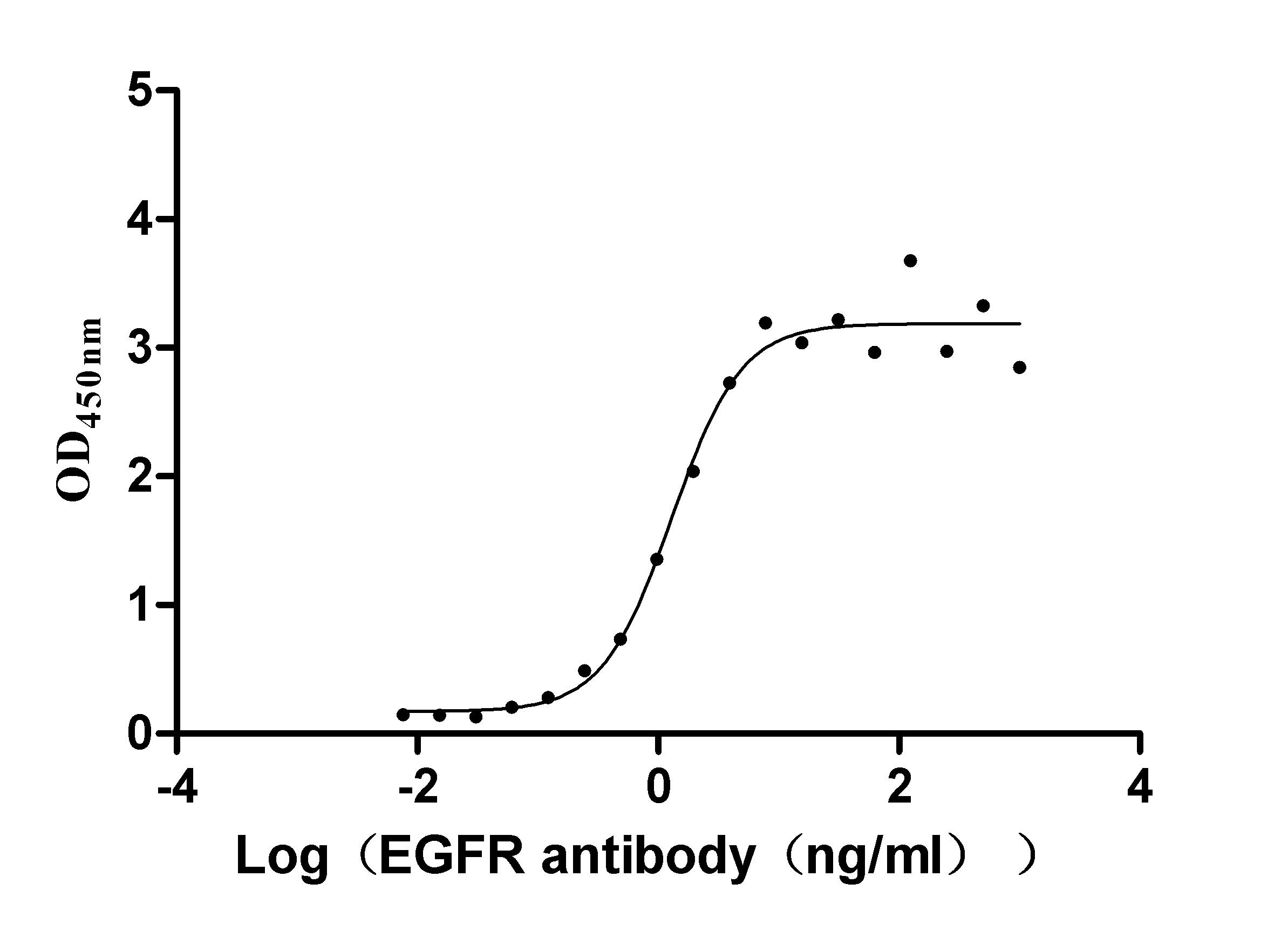 The recombinant human epidermal growth factor receptor (EGFR) is expressed from mammalian cells and fused with a 10xHis-tag at the N-terminus and a Myc-tag at the C-terminus. It contains amino acid residues 25-645 of the human EGFR protein. Its protein length covers the extracellular domain of the EGFR protein. The purity of this EGFR protein is greater than 90% determined by SDS-PAGE. The endotoxin content of recombinant EGFR protein is less than 1.0 EU/ug measured by the LAL method. Importantly, it has been validated to be active. In the functional ELISA, this EGFR protein can bind to the anti-EGFR antibody and Cetuximab, respectively. The EC50 is 2.867-3.571 ng/ml and 0.6919-1.047 ng/ml, respectively. In the LSPR assay, the human EGF captured on the COOH chip can bind to this EGFR protein with an affinity constant of 11.9 nM. And it is in stock now.