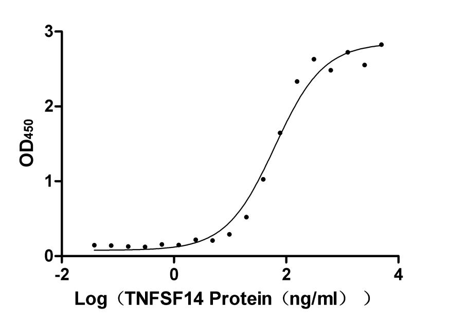 Measured by its binding ability in a functional ELISA. Immobilized TNFRSF14 at 5 μg/ml can bind human TNFSF14(CSB-MP023991HUj2), the EC50 is 49.85-79.31 ng/ml