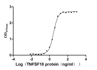Measured by its binding ability in a functional ELISA. Immobilized TNFRSF18 at 2 μg/ml can bind TNFSF18 (CSB-MP891791HU), the EC50 is 2.565 to 2.940 ng/ml. Biological Activity Assay -