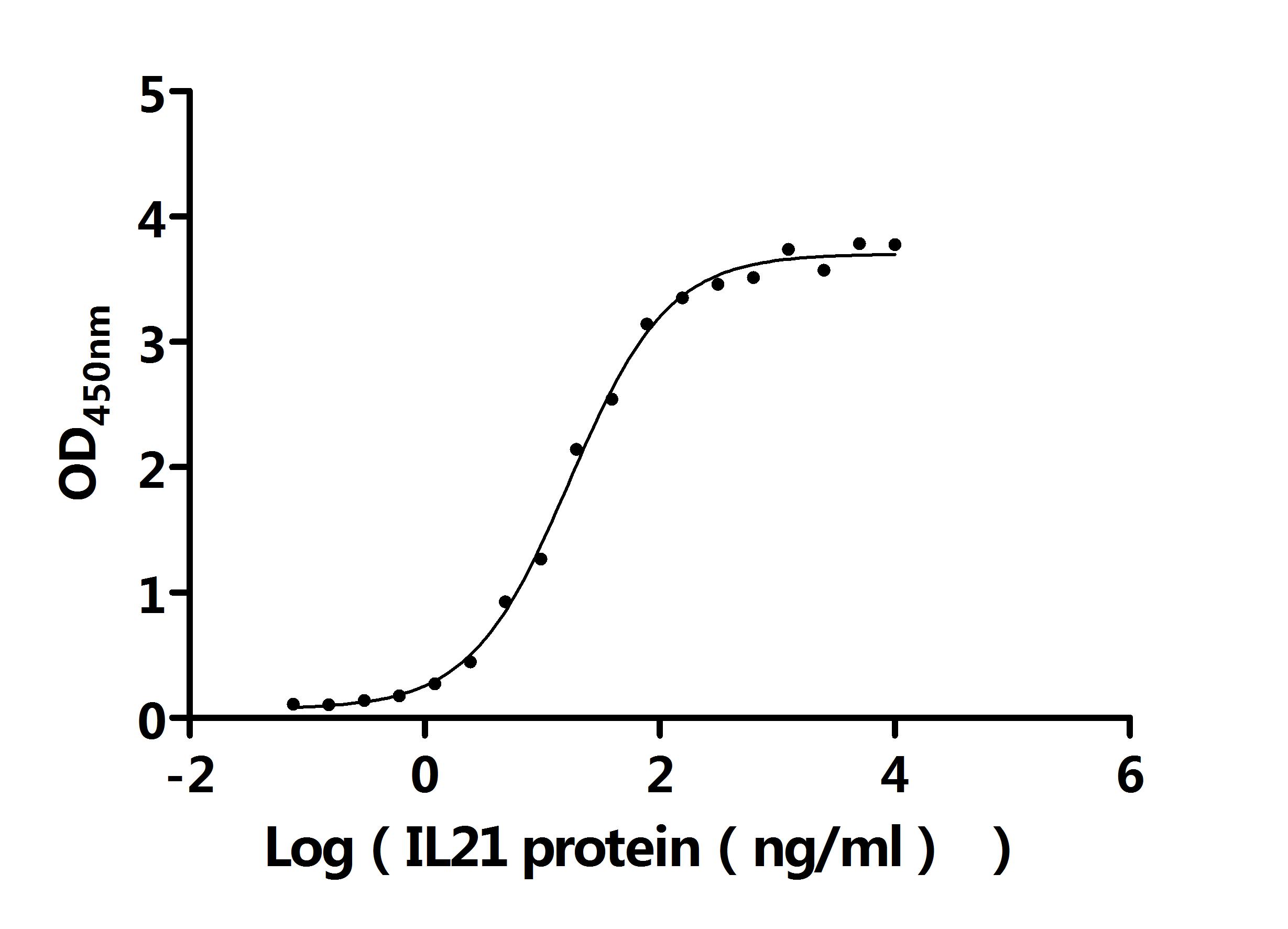 ①M(fèi)easured by its binding ability in a functional ELISA. Immobilized Macaca fascicularis IL21R at 2 μg/ml can bind Human IL21 (CSB-MP872537HU). The EC50 is 15.01-19.43 ng/mL. Biological Activity Assay -