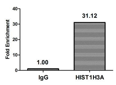 • Chromatin Immunoprecipitation Hela (4*106, treated with 30mM sodium 3-hydroxybutyrate for 4h) were treated with Micrococcal Nuclease, sonicated, and immunoprecipitated with 5µg anti-HIST1H3A (CSB-PA010418OA18bhbHU) or a control normal rabbit IgG. The resulting ChIP DNA was quantified using real-time PCR with primers against the β-Globin promoter.