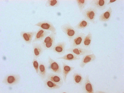 • Immunocytochemistry analysis of CSB-PA010418OA18bhbHU diluted at 1:50 and staining in Hela cells (treated with 50mM sodium 3-hydroxybutyrate for 4h) performed on a Leica BondTM system. The cells were fixed in 4% formaldehyde, permeabilized using 0.2% Triton X-100 and blocked with 10% normal goat serum 30min at RT. Then primary antibody (1% BSA) was incubated at 4°C overnight. The primary is detected by a biotinylated secondary antibody and visualized using an HRP conjugated SP system.