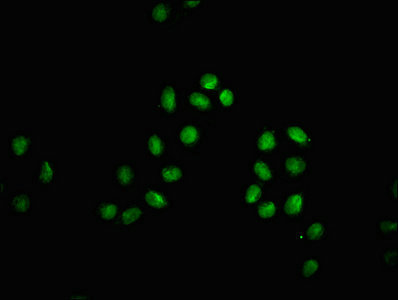 • Immunofluorescence staining of Hela cells (treated with 30mM sodium 3-hydroxybutyrate for 4h) with CSB-PA010418OA18bhbHU at 1:25, counter-stained with DAPI. The cells were fixed in 4% formaldehyde, permeabilized using 0.2% Triton X-100 and blocked in 10% normal Goat Serum. The cells were then incubated with the antibody overnight at 4°C. The secondary antibody was Alexa Fluor 488-congugated AffiniPure Goat Anti-Rabbit IgG(H+L).