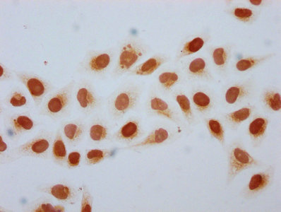 Immunocytochemistry analysis of CSB-PA010403OA34hibHU diluted at 1:10 and staining in Hela cells (treated with 30mM sodium butyrate for 4h) performed on a Leica BondTM system. The cells were fixed in 4% formaldehyde, permeabilized using 0.2% Triton X-100 and blocked with 10% normal goat serum 30min at RT. Then primary antibody (1% BSA) was incubated at 4°C overnight. The primary is detected by a biotinylated secondary antibody and visualized using an HRP conjugated SP system.
