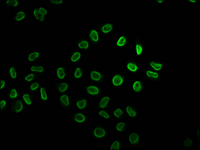 Immunofluorescence staining of Hela cells (treated with 30mM sodium butyrate for 4h) with CSB-PA010403OA34hibHU at 1:5, counter-stained with DAPI. The cells were fixed in 4% formaldehyde, permeabilized using 0.2% Triton X-100 and blocked in 10% normal Goat Serum. The cells were then incubated with the antibody overnight at 4°C. The secondary antibody was Alexa Fluor 488-congugated AffiniPure Goat Anti-Rabbit IgG(H+L).