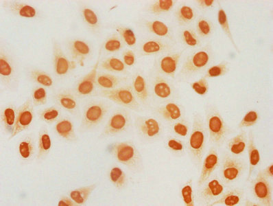 Immunocytochemistry analysis of CSB-PA010418PA18hibHU diluted at 1:25 and staining in Hela cells (treated with 30mM sodium butyrate for 4h) performed on a Leica BondTM system. The cells were fixed in 4% formaldehyde, permeabilized using 0.2% Triton X-100 and blocked with 10% normal goat serum 30min at RT. Then primary antibody (1% BSA) was incubated at 4°C overnight. The primary is detected by a biotinylated secondary antibody and visualized using an HRP conjugated SP system.