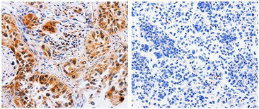 The image on the left is immunohistochemistry of paraffin-embedded Human lung cancer tissue using 31024 (AAK1 Antibody) at dilution 1/30, on the right is treated with the fusion protein.