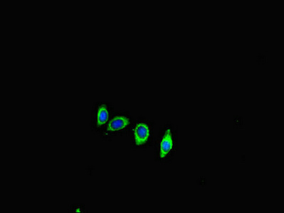 Immunofluorescent analysis of HepG2 cells using CSB-PA866317LA01HU at dilution of 1:100 and Alexa Fluor 488-congugated AffiniPure Goat Anti-Rabbit IgG(H+L)