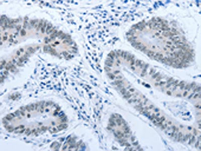 The image on the left is immunohistochemistry of paraffin-embedded Human colon cancer tissue using CSB-PA956054(ACIN1 Antibody) at dilution 1/30, on the right is treated with synthetic peptide. (Original magnification: ×200)