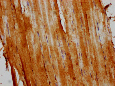 IHC image of CSB-PA001205NJ01HU diluted at 1:400 and staining in paraffin-embedded human skeletal muscle tissue performed on a Leica BondTM system. After dewaxing and hydration, antigen retrieval was mediated by high pressure in a citrate buffer (pH 6.0). Section was blocked with 10% normal goat serum 30min at RT. Then primary antibody (1% BSA) was incubated at 4°C overnight. The primary is detected by a biotinylated secondary antibody and visualized using an HRP conjugated SP system.