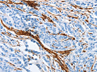 The image on the left is immunohistochemistry of paraffin-embedded Human prostate cancer tissue using CSB-PA125050(ACTA2 Antibody) at dilution 1/30, on the right is treated with synthetic peptide. (Original magnification: ×200)