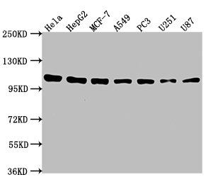 Positive WB detected in: Hela whole cell lysate, HepG2 whole cell lysate, MCF-7 whole cell lysate, A549 whole cell lysate, PC3 whole cell lysate, U251 whole cell lysate, U87 whole cell lysate