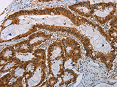 The image on the left is immunohistochemistry of paraffin-embedded Human colon cancer tissue using CSB-PA616041(ACY1 Antibody) at dilution 1/25, on the right is treated with fusion protein. (Original magnification: ×200)