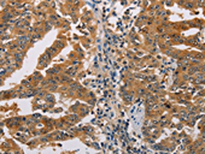 The image on the left is immunohistochemistry of paraffin-embedded Human gastic cancer tissue using CSB-PA616041(ACY1 Antibody) at dilution 1/25, on the right is treated with fusion protein. (Original magnification: ×200)